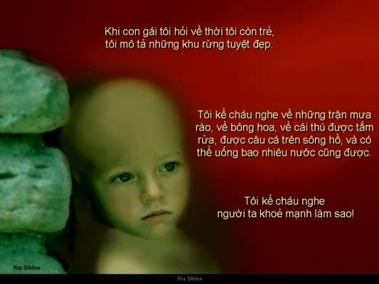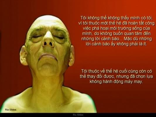 Tôi hy vọng các bạn sẽ giúp tôi gửi link này đến nhiều người hơn nữa để thấy được sự tàn phá khủng khiếp môi trường mà hậu quả của nó sẽ ảnh hưởng đến chúng ta và các thế hệ sau của chúng ta. Bi thảm hơn sự sống trên trái đất này sẽ bị diệt vong bởi bàn tay tàn phá của con người chứ không cần đợi đến một thảm họa khác (như thiên thạch va vào chẳng hạn).