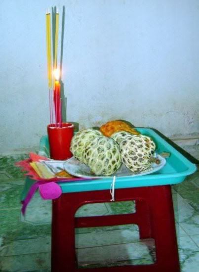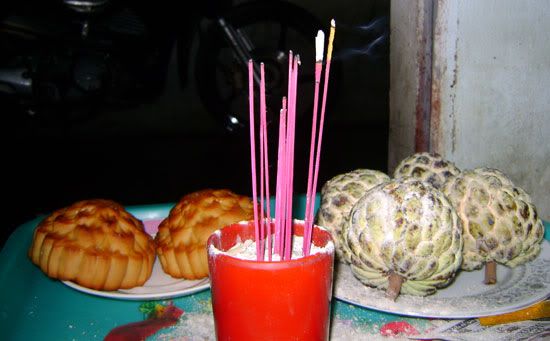 Cúng ở trước cửa phòng, lúc đó ko biết sao quên mua hoa, chỉ có mẵng cầu với bánh trung thu thôi !